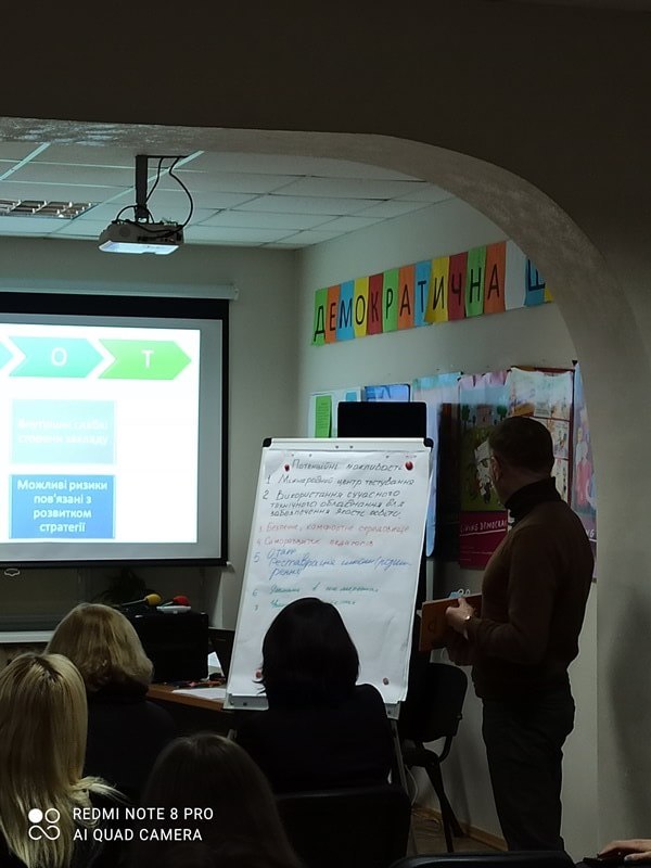 На засідання обговорювався хід реалізації освітнього проекту «Демократична школа». Інтерактив SWOT став результатом самоаналізу діяльності закладу, що передує розробці Стратегії розвитку школи демократичним шляхом.