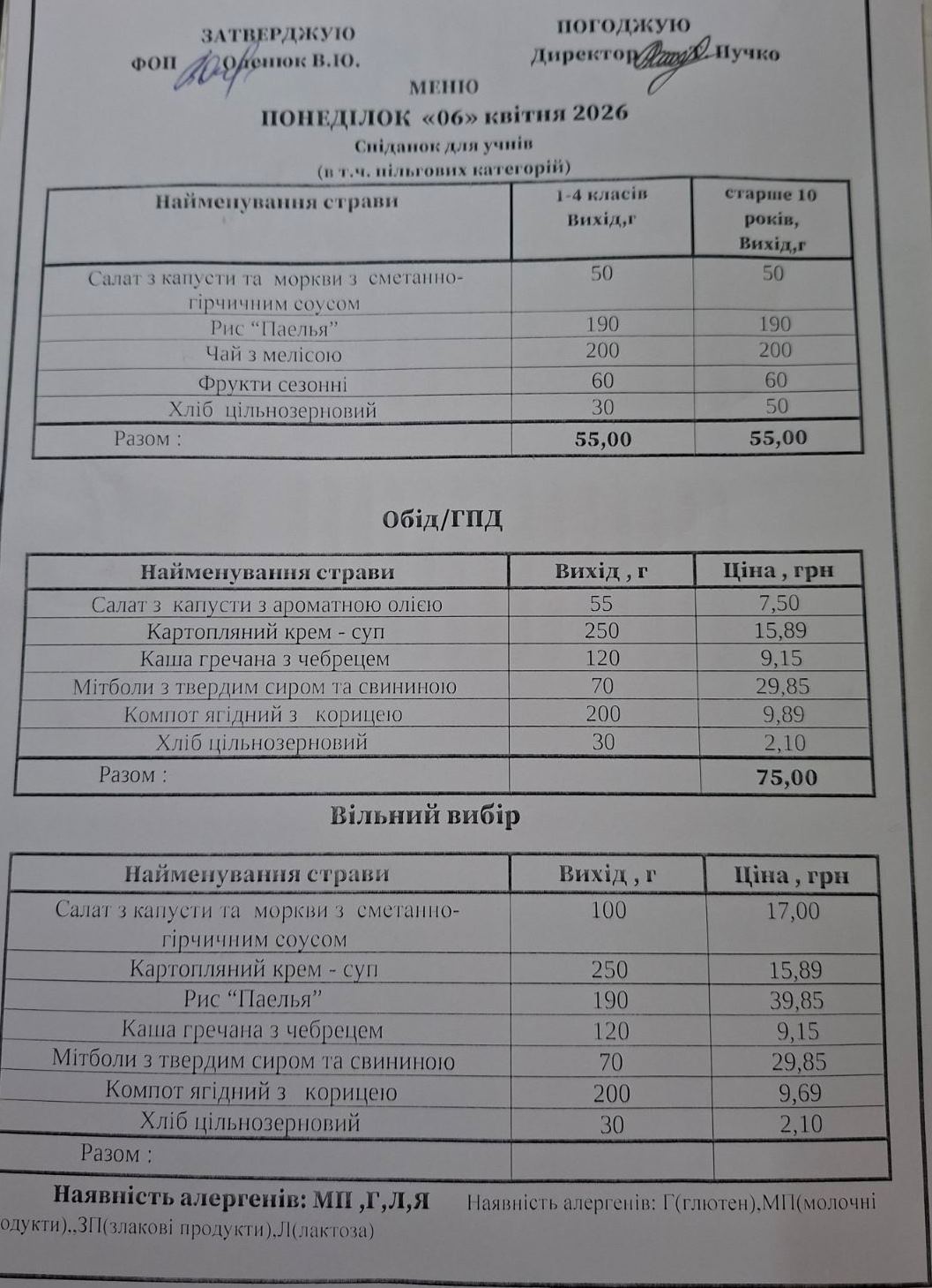 Меню шкільної їдальні на 29 травня 2025 року